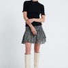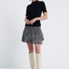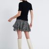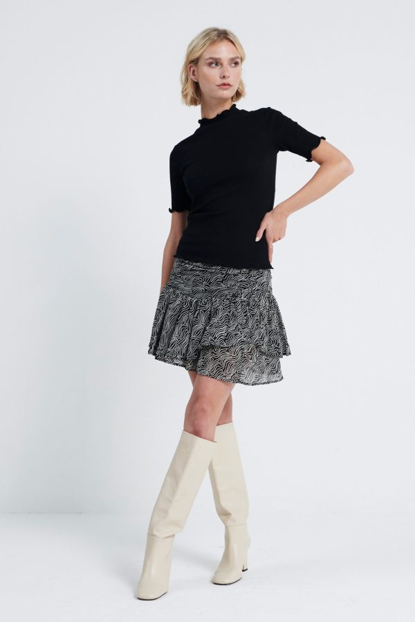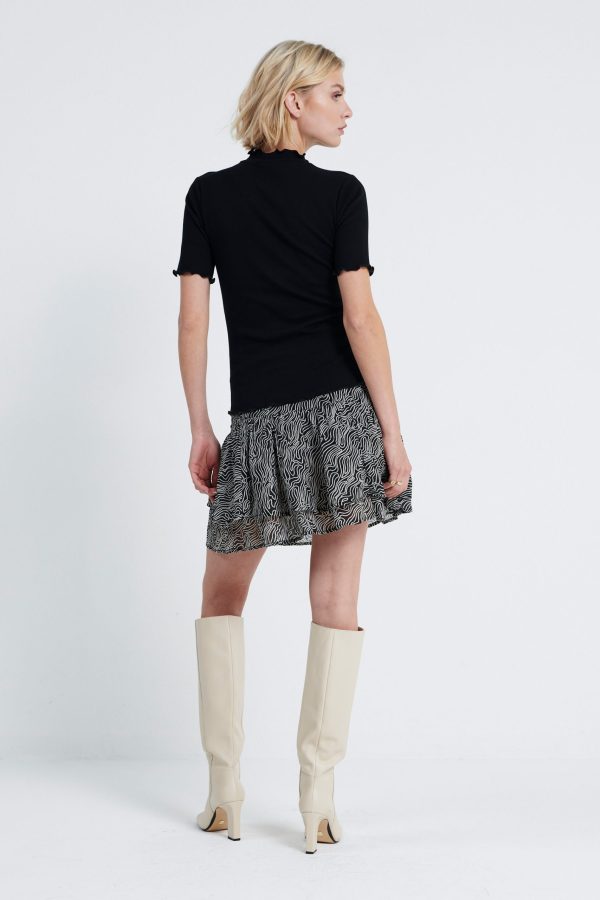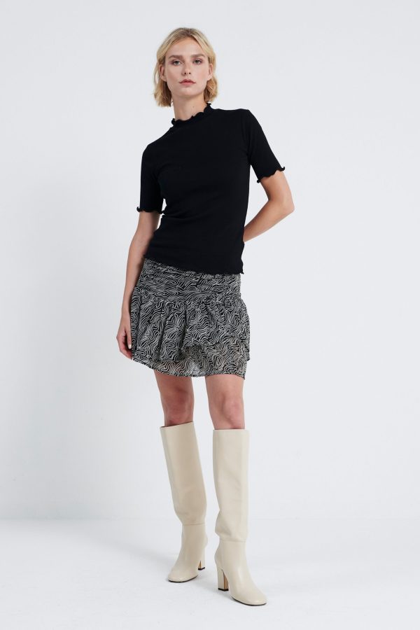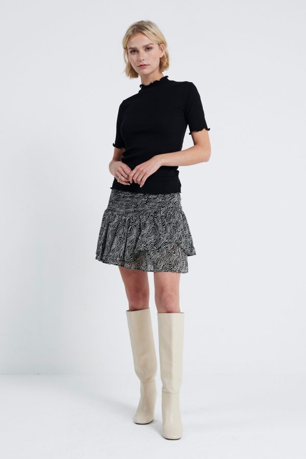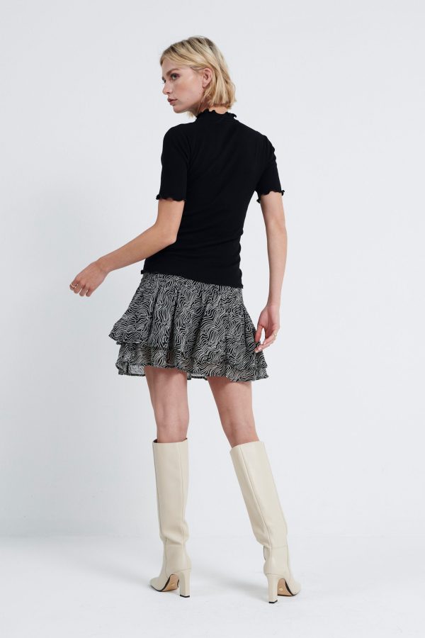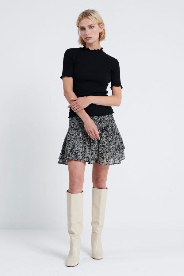 De Aya Skirt, is een gevoerde mini rok. De rok heeft een overslag ruffle aan de voorzijde en is voorzien van een blinde ritssluiting. Model is 175 en draagt maat S
