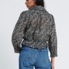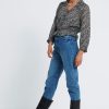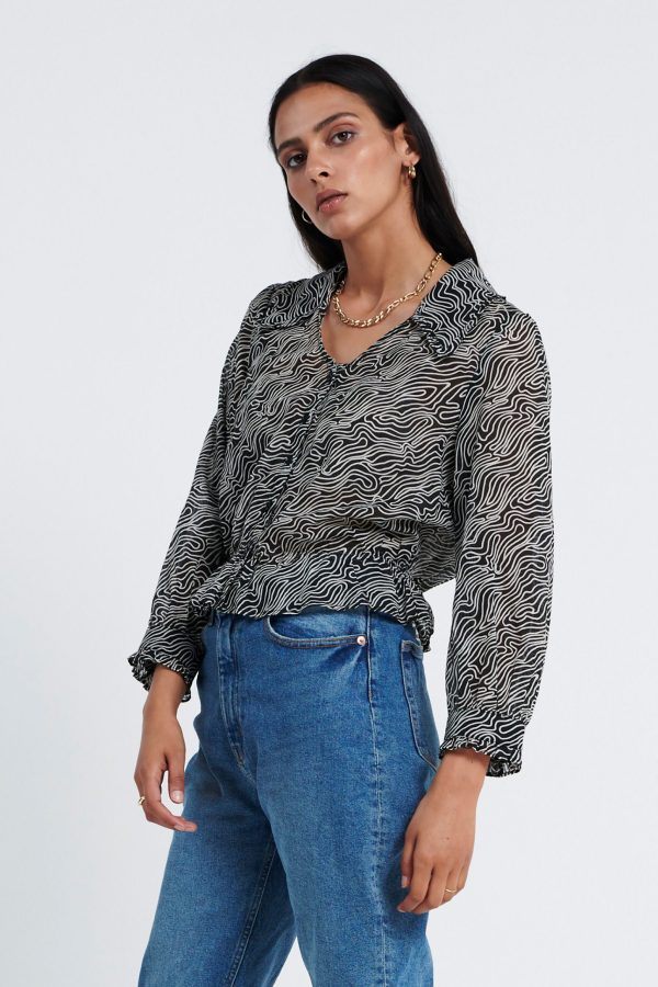 De Bella Blouse, met all over print heeft een V hals en valt iets korter op de taille Model is 175 en draagt maat S