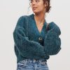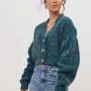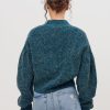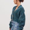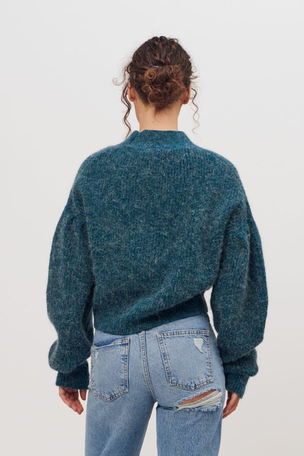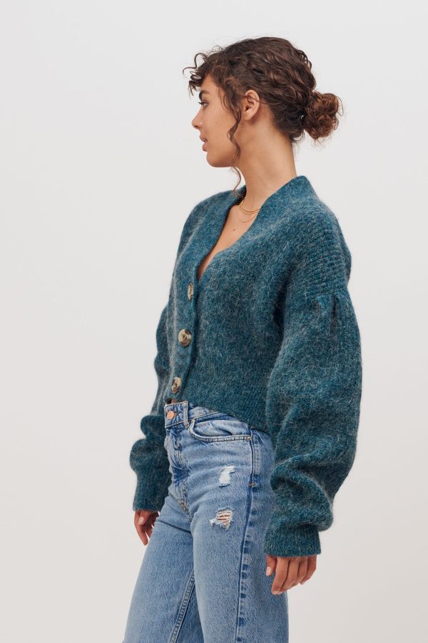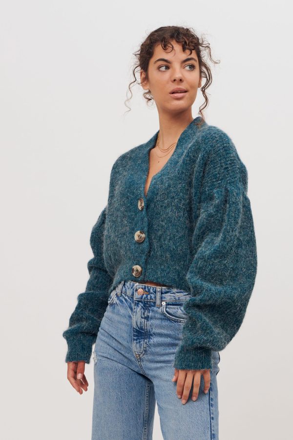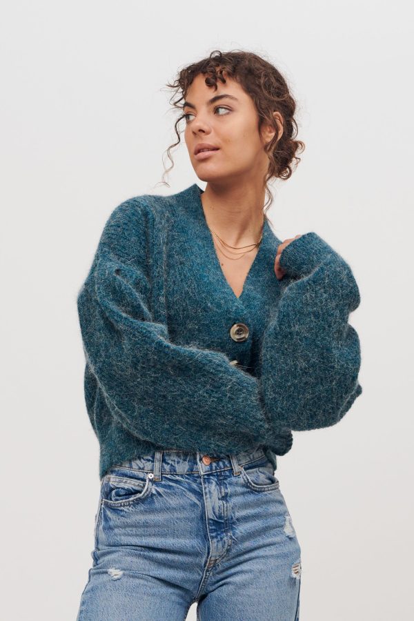 Het vest heeft een rijke petrol kleur en een diepe V-hals met knoopsluiting in de taille. De schouders zijn gepoft en vallen in een pof rond de pols. Combineer met bijpassende sjaal & muts.