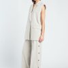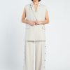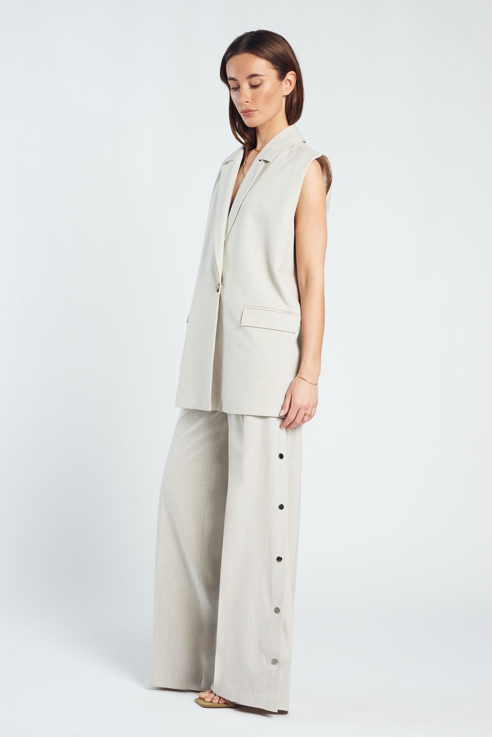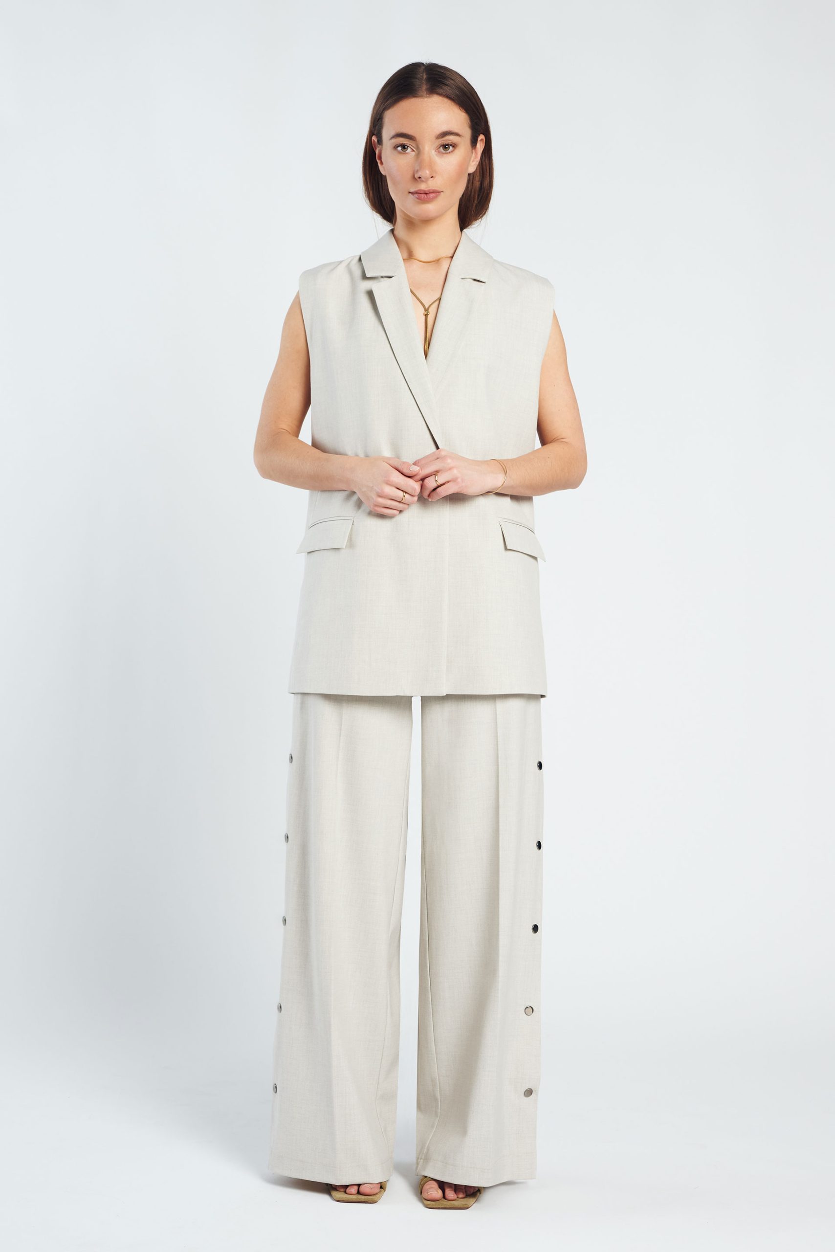 De Denia Pants is een moderne pantalon met een lange, wijd uitlopende pijp en een verfijnde uitstraling. Uitgevoerd in een zachte beige melange tint en gemaakt van een soepele, geweven kwaliteit die mooi valt. De drukknopen langs de zijkant geven de broek een eigentijdse twist: draag ze gesloten voor een clean silhouet of open als subtiele split voor extra beweging.