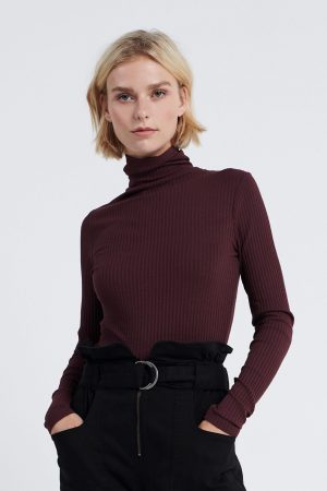 De Evy top heeft een zachte rib met een col. De top is aansluitend. Model is 175 en draagt maat S.