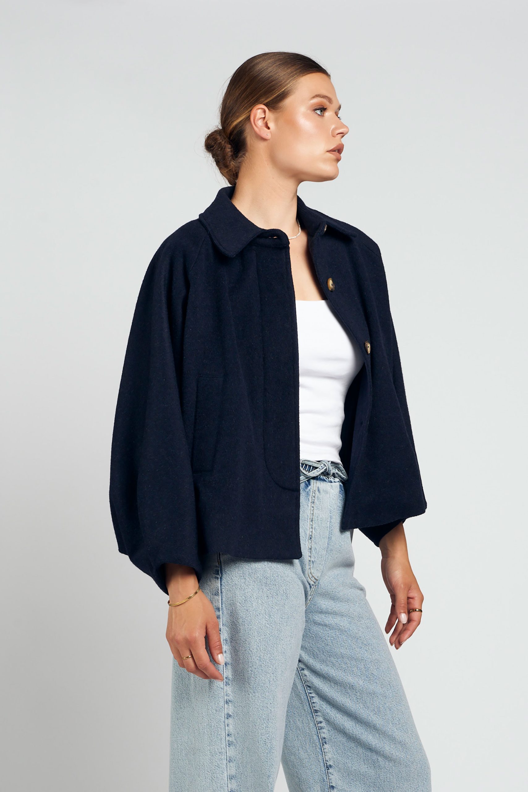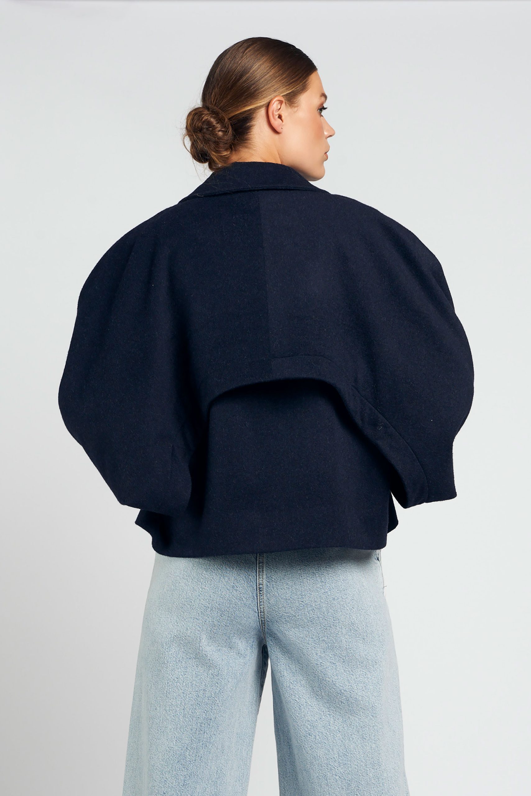 Geef je look een stijlvolle upgrade met deze donkerblauw-kleurige cropped jacket. Het jasje is gemaakt van een luxe wolmix die zacht aanvoelt en tegelijkertijd warmte biedt. De oversized ballonmouwen en de iets kortere lengte geven het een moderne, vrouwelijke uitstraling. Aan de voorzijde sluit het jasje met subtiele knopen en heeft het praktische steekzakken.