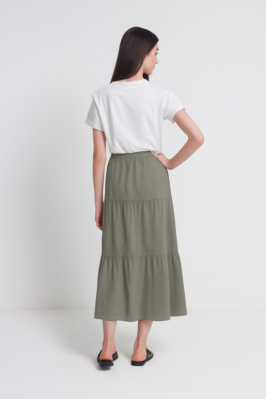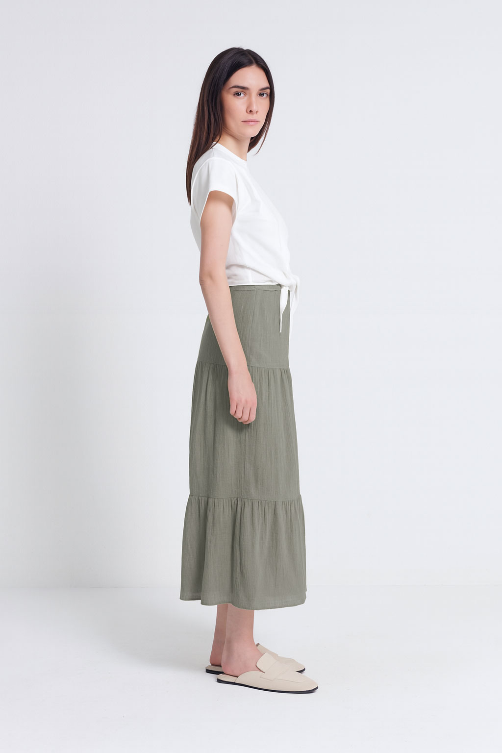 De Jagger skirt is een luchtige, vrouwelijke rok met een tijdloze uitstraling. De zachte groene kleur en de soepel vallende stof zorgen voor een elegante look met een ontspannen feel. De elastische tailleband biedt comfort, terwijl de gelaagde banen de rok een speelse beweging geven. Perfect voor zowel casual als meer geklede momenten.