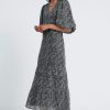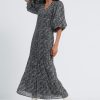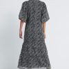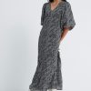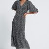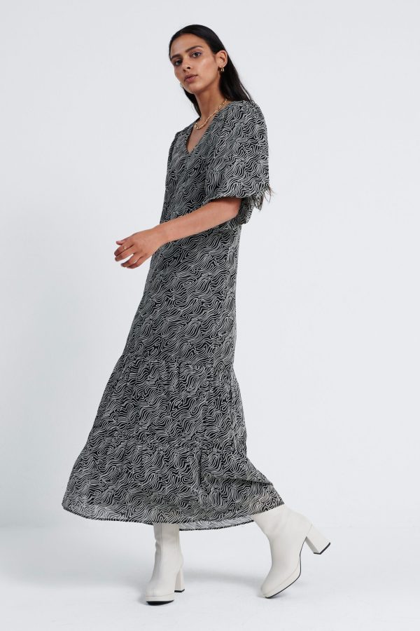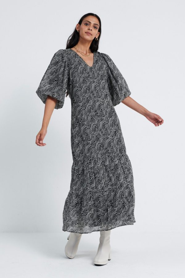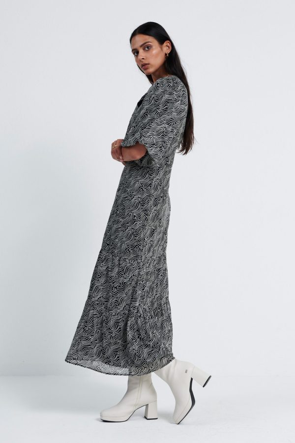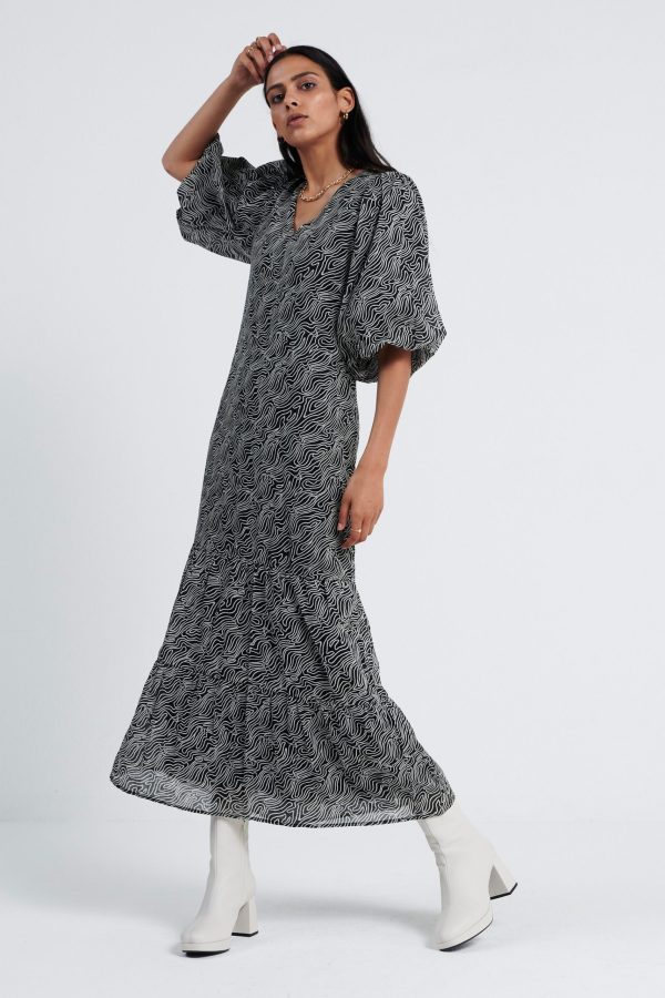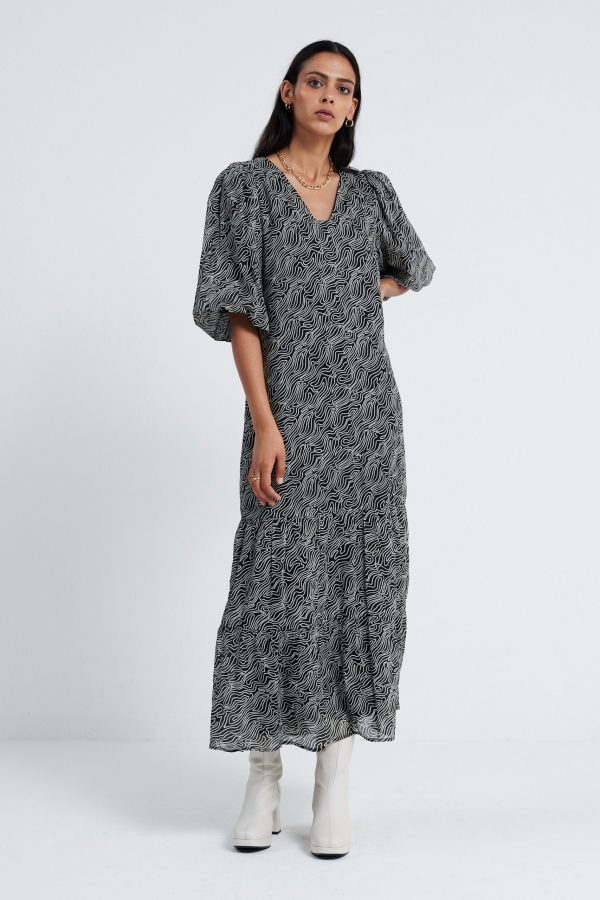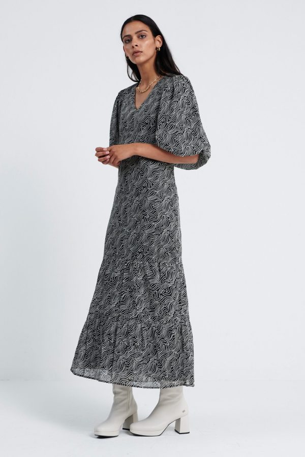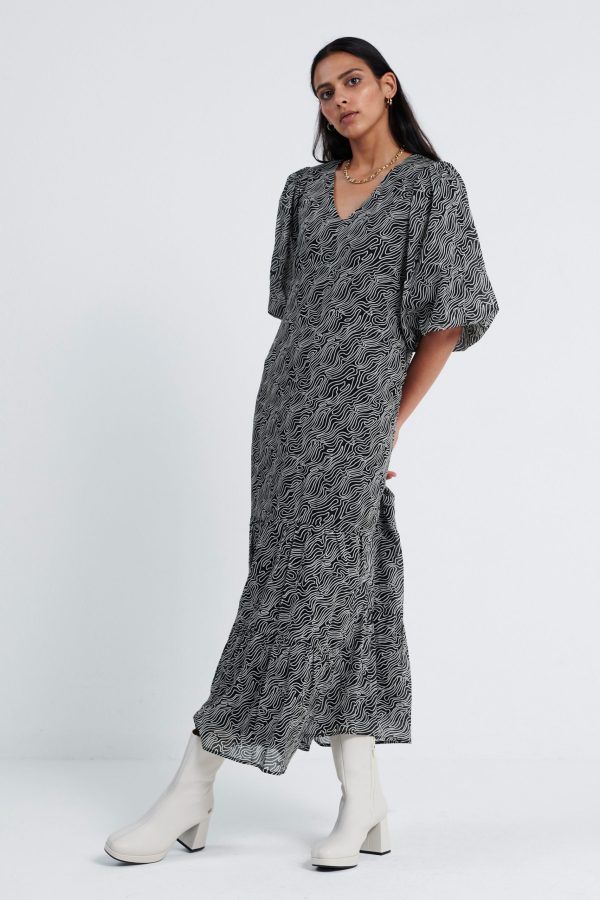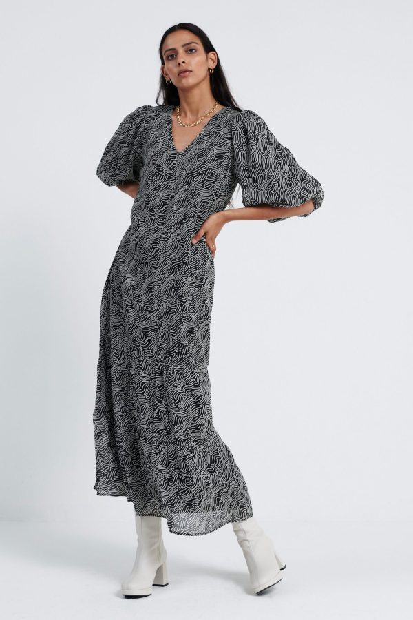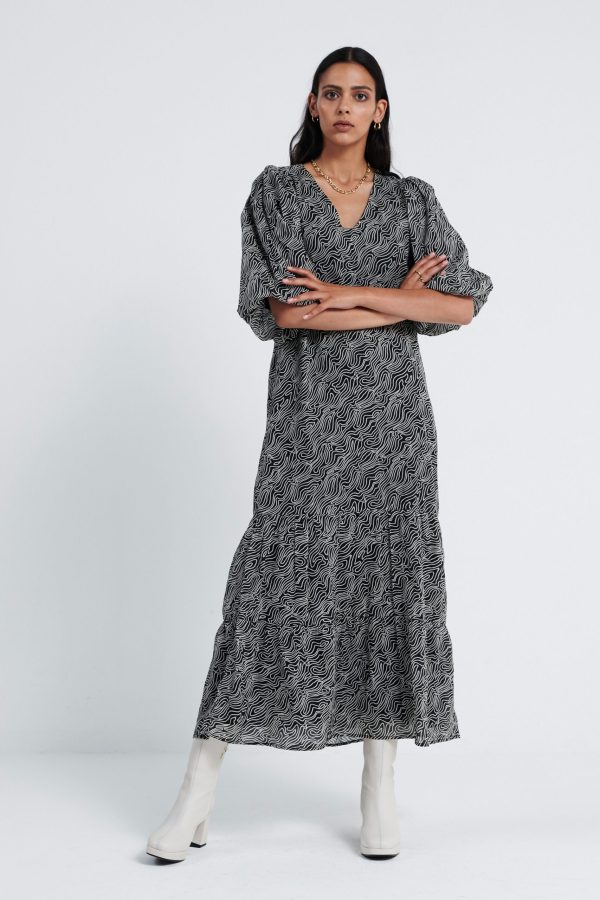 De Leah Dress, is een midi jurk met all over print en een V hals. De mouwen, welke gepoft zijn en eindigen in de elleboog. Aan de onderkant heeft de jurk plooidetails. Model is 175 en draagt maat S
