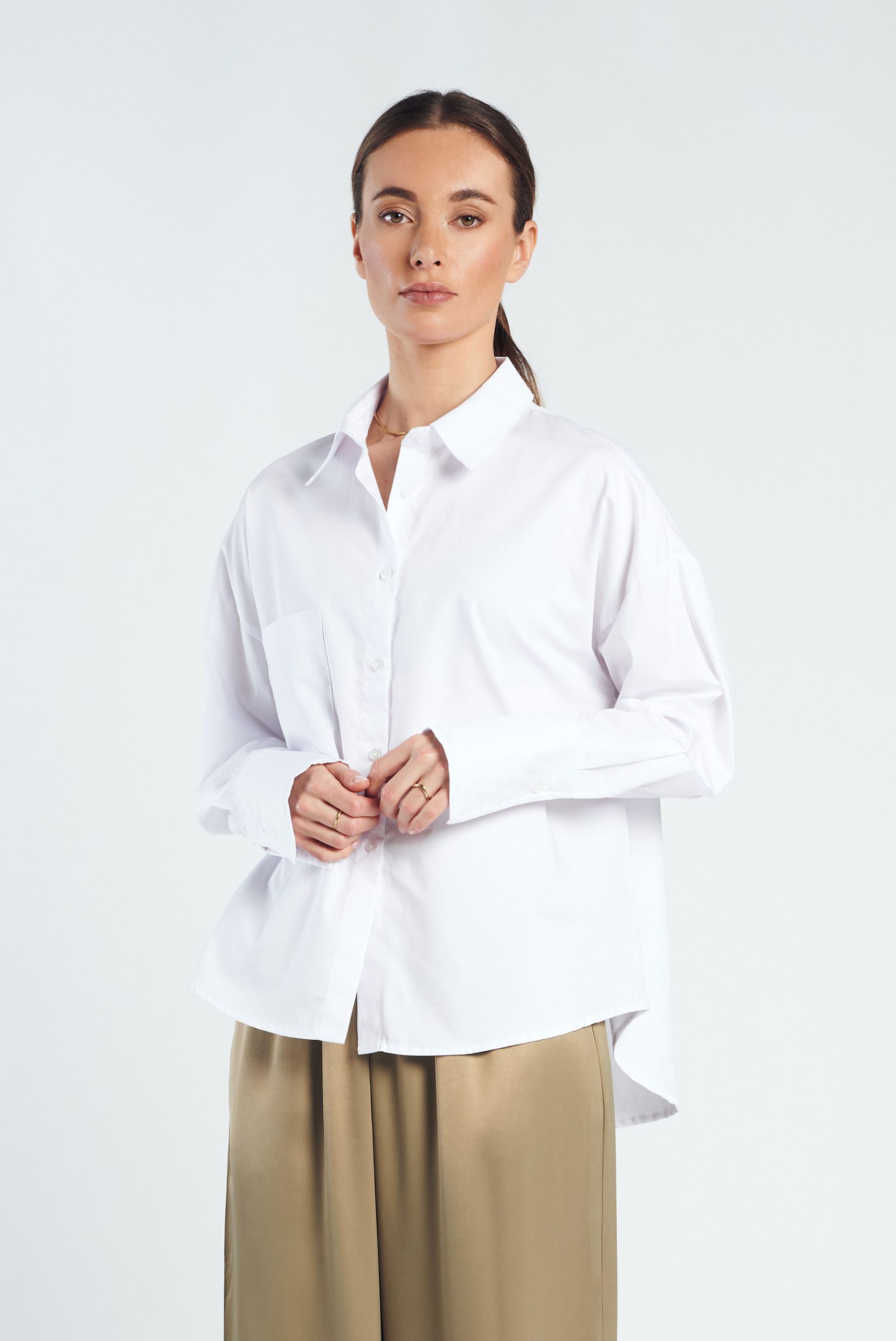 Deze tijdloze witte blouse is een must-have voor elke garderobe. De blouse is gemaakt van 100% viscose met een satijn-look. De stof heeft een subtiele glans. De blouse is voorzien van lange manchetten, die een elegante en verfijnde uitstraling geven en is daarom ideaal voor zowel formele als casual gelegenheden. Aan de voorkant bevindt zich een subtiele borstzak die een stijlvolle twist geeft aan het minimalistische ontwerp.