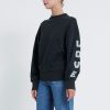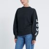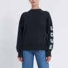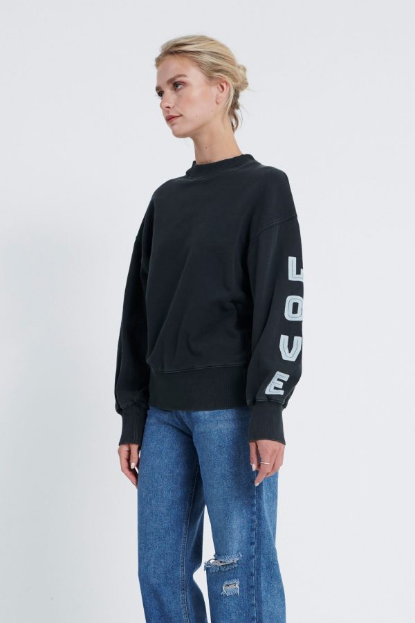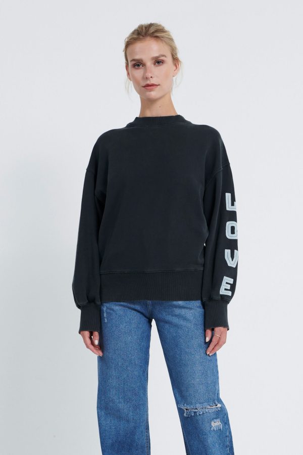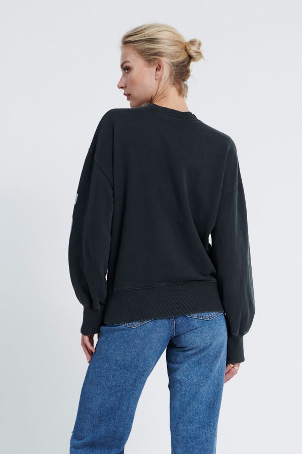 De Mischa Sweater. Heeft een oversized fit. De Sweater heeft een lichte wassing. Op de linker mouw is er een tekst geprint. Model is 175 en draagt maat S