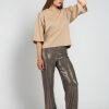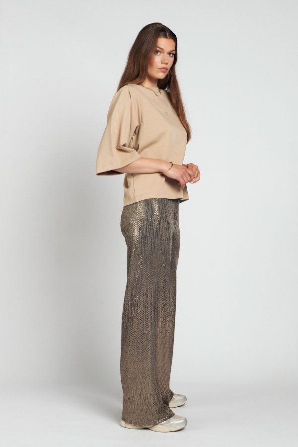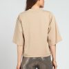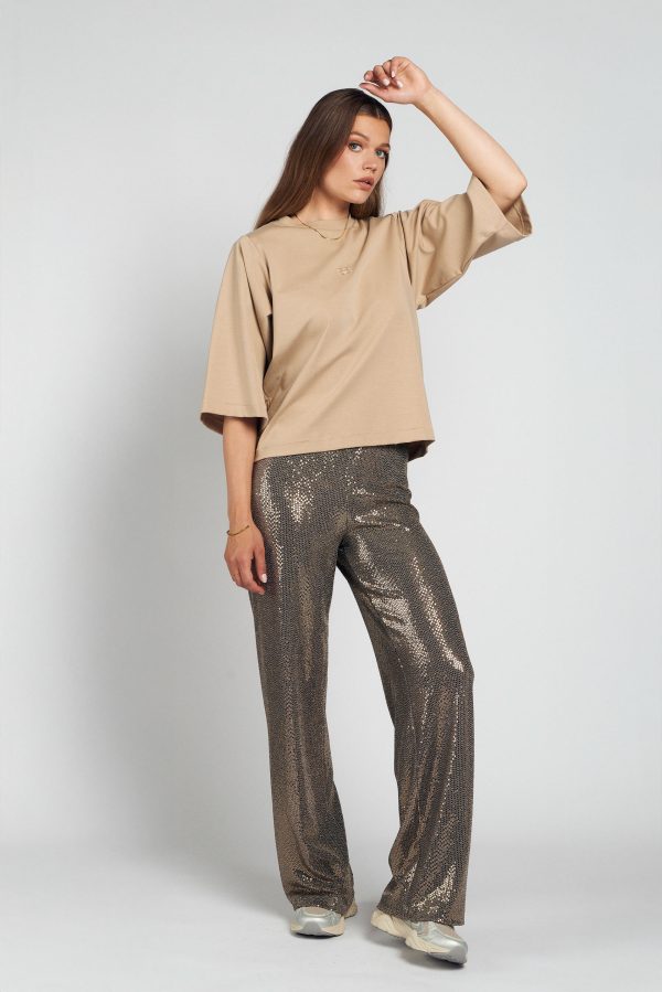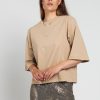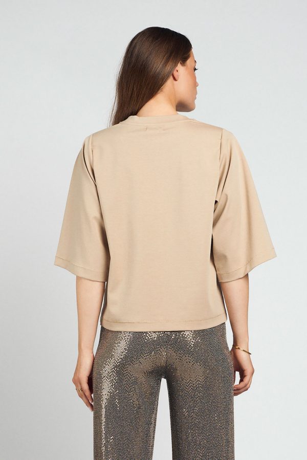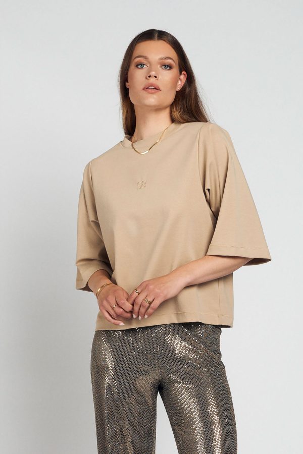 Geef je look een krachtig statement met ons oversized shirt met schoudervulling. Simpel, stijlvol en super comfortabel. Deze beige oversized tee is de perfecte basic met een twist. De wijde mouwen en relaxte pasvorm geven ‘m een moderne, minimalistische look. Subtiel afgewerkt met een ton-sur-ton geborduurd logo op de borst voor nét dat beetje extra. Combineer ‘m met een kanten longsleeve eronder voor een gelaagde outfit met karakter — net als op de foto — of draag ‘m solo voor een cleane look.