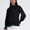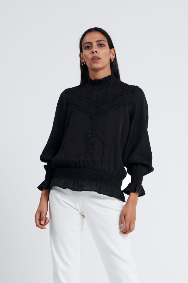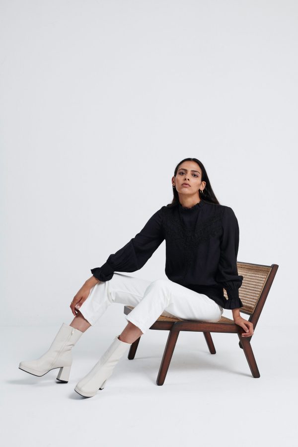 De Remy Blouse heeft een luchte stof en een turtle nek met plooidetail. De manchet heeft een elastiek en aan de onderkant en ook een plooidetail daarnaast heeft de voorkant een geborduurd patroon. Model is 175 en draagt maat S